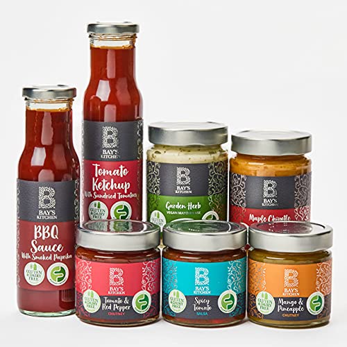 Details: Product description Bay’s Kitchen Low FODMAP Condiment & Chutney Selection Pack is a great way to try out our delicious condiments and chutneys for a great deal, particularly if you’re just starting to follow the Low FODMAP Diet! This pack contains all 7 of our Low FODMAP, Gluten Free, Dairy Free, Vegan condiments and chutneys: Tomato Ketchup with Sundried Tomatoes BBQ Sauce with Smoked Paprika Maple Chipotle Vegan Mayonnaise Garden Herb Vegan Mayonnaise Mango & Pineapple Chutney Tomato & Red Pepper Chutney Spicy Tomato Salsa (7 pack, 3 x 200g jars, 2 x 260g jars, one 270g bottle and one 275g bottle). Ingredients Ketchup: Tomato Passata (53%), Tomato Puree (13%), Spirit Vinegar, Sugar, Water, Dextrose, Cornflour, Sundried Tomatoes (1%), Salt, Olive Oil, Paprika, Black Pepper. Manufacturer Contact Information Bay’s Kitchen Ltd, PO Box 1356, Cheltenham, Gloucestershire, GL50 9HJ, United Kingdom