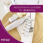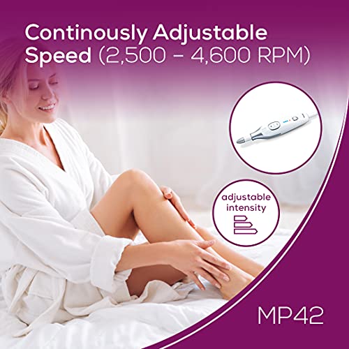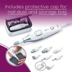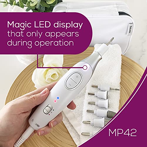 Details: Achieve salon quality nail care from the comfort of your home with the Beurer MP42 electronic nail drill. The powerful fingernail drill can be used on natural or acrylic nails and fingernails or toenails. Our nail dremel comes equipped with 7 different high-quality sapphire and felt attachments that can be easily stored in the storage case included. ? The Sapphire Cone ? Used for removing dry skin or calluses from the soles and heels of the feet and for manicuring nails. ? Sapphire Disk with a fine grain texture ? Used for filing and treatment of the nails ? Sapphire Disk with a coarse grain texture ? Used for filing and treatment of the nails. ? Sapphire Callus Rasp ? Used for the fast removal of thick or large calluses on the soles and heels of the feet. ? Flame Milling Cutter ? Used for removing ingrown nails on both hands and feet ? Cylindrical Milling Gutter ? Used for the grinding and smoothing of any lignified foot nail surfaces. ? Felt Cone ? Used for smoothing and polishing the edge of nails after filing, as well as for cleaning the nail surface.