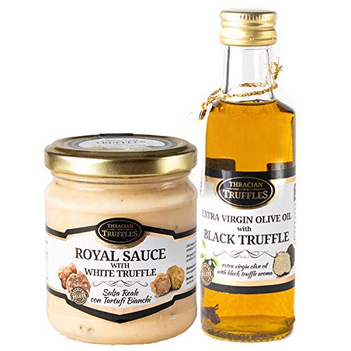 Details: Ingredients Extra virgin with black truffle – olive oil, a piece of summer black truffle (Tuber Aestivum), aroma – truffle. White Truffle Royal Sauce – White truffle sauce – cream, cheese, white truffle (Tuber magnatum Pico) – 1%, white truffle (Tuber borchii) – 3%, durum wheat flour, salt, aroma – truffle, preservative – lysozyme (from eggs). Directions Just a few drops would be enough for you to achieve perfection with your cuisine.