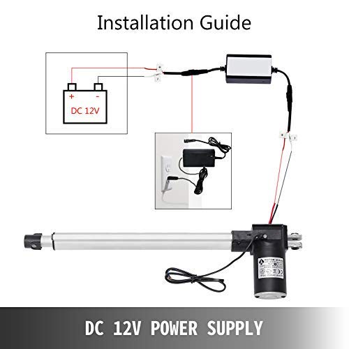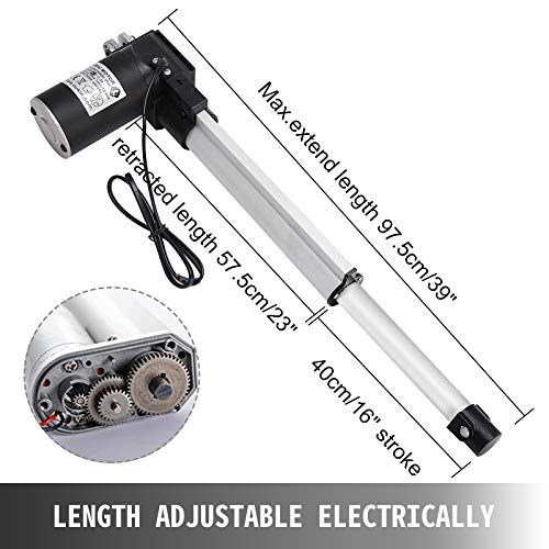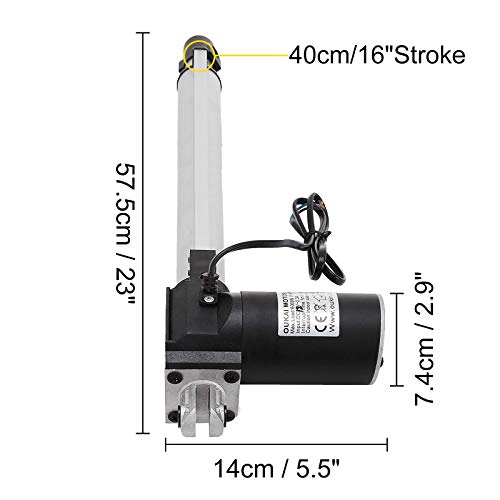 • Premium Quality: Type: Type: Heavy-duty actuator; Stroke Length: 16″; Travel Speed: 5 mm/s; Power: DC 12V; Limit Switch: Built-in; This linear actuator features φ24 mm thick aluminum alloy tube and the metal construction for functional load capacity and durability. It is sturdy, well-sealed, and has IP44 level protection.