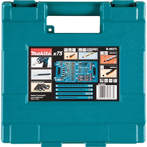 Details: Get one convenient set of bits and sockets for drilling, driving and fastening in one convenient carrying case with the Makita 75-piece metric drill and screw bit set (B-49373). The set includes bits for drilling into metal, wood and masonry materials as well as insert and power bits for fastening applications. Fastening applications are covered with an assortment of Phillips, Pozidriv, Torx, slotted and hex insert bits. The set also includes titanium nitride coated high-speed steel (HSS-tin) metal and wood drill bits, brad point wood drill bits, and masonry hammer drill bits with straight shank for use with most 3/8? and ?? drills. The kit also includes a center punch, ?? hex countersink, ?? hex Nut drivers, and a ?? hex magnetic bit holder.